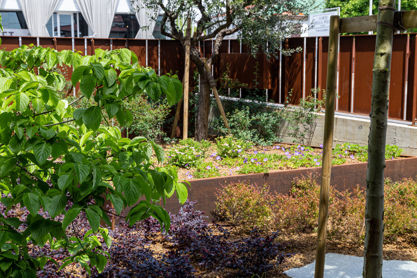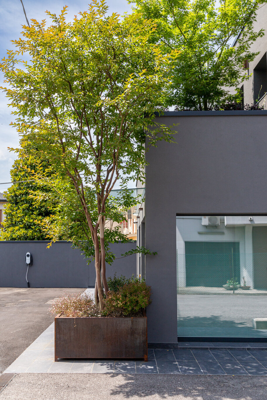 E’ stata inserita un’area in un terrazzo adiacente agli uffici, delle vasiere al pianterreno vicino all’ingresso ed una parte di verde a terra fronte strada.