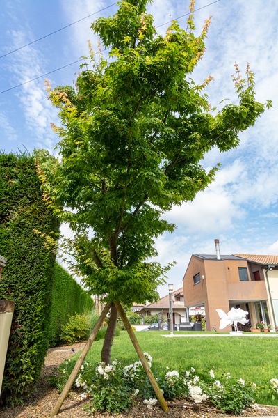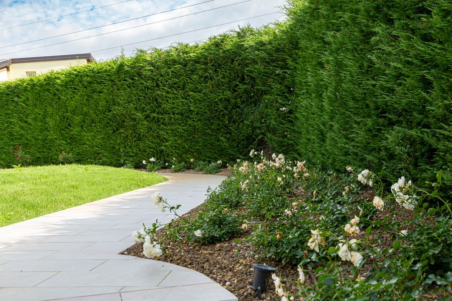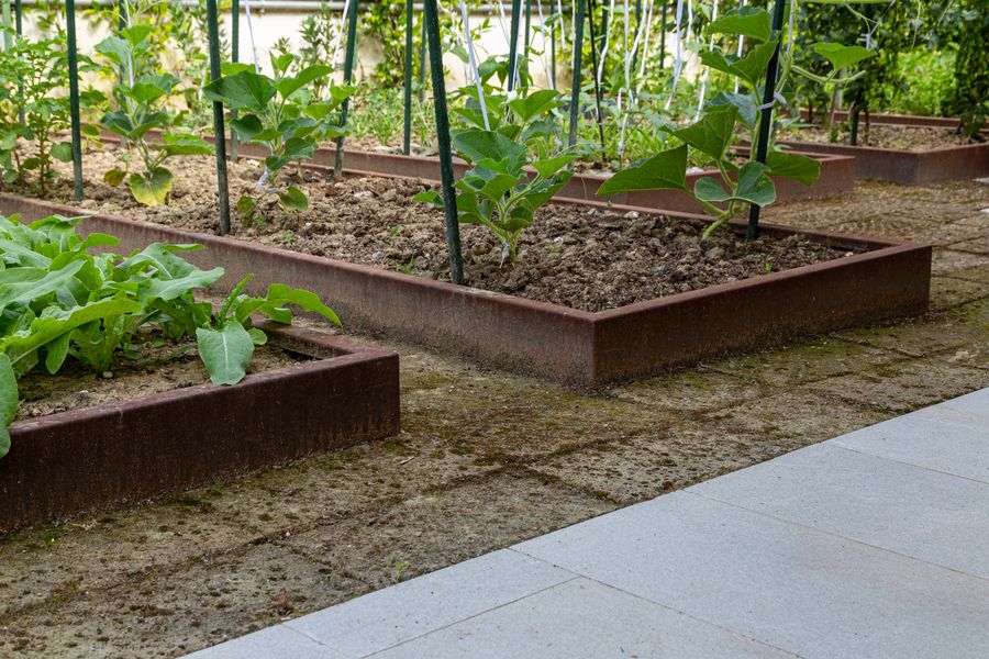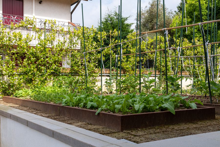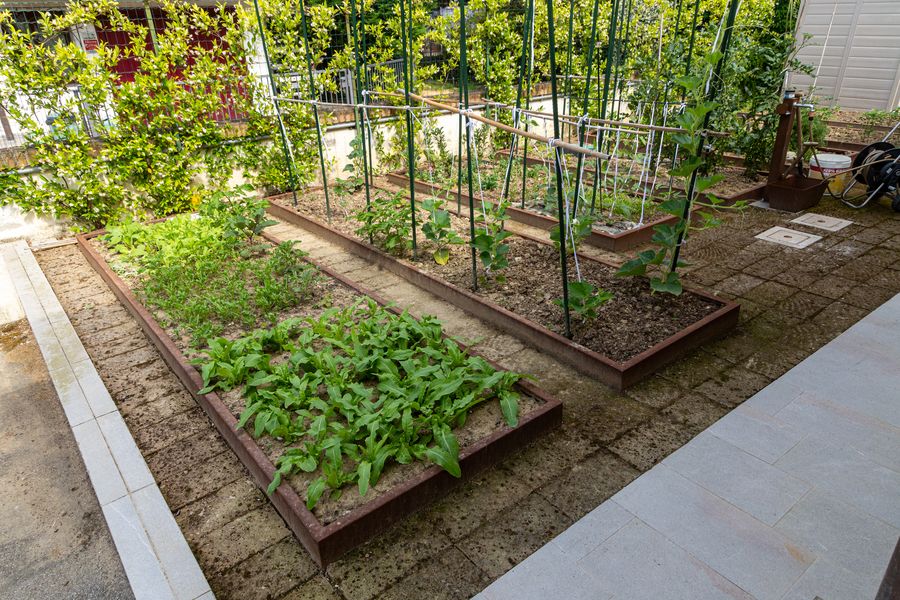 Si è realizzata una barriera verde perimetrale per dare la massima privacy alla piscina presente. Tra le piante inserite spicca una Parrotia Persica, scelta per le sue particolari virate di colore durante le stagioni. Una parte del giardino, dal lato opposto dell’abitazione, è stato adibito a zona orto attraverso la realizzazione di camminamenti in pietra di tufo e di strutture contenitive in corten.
