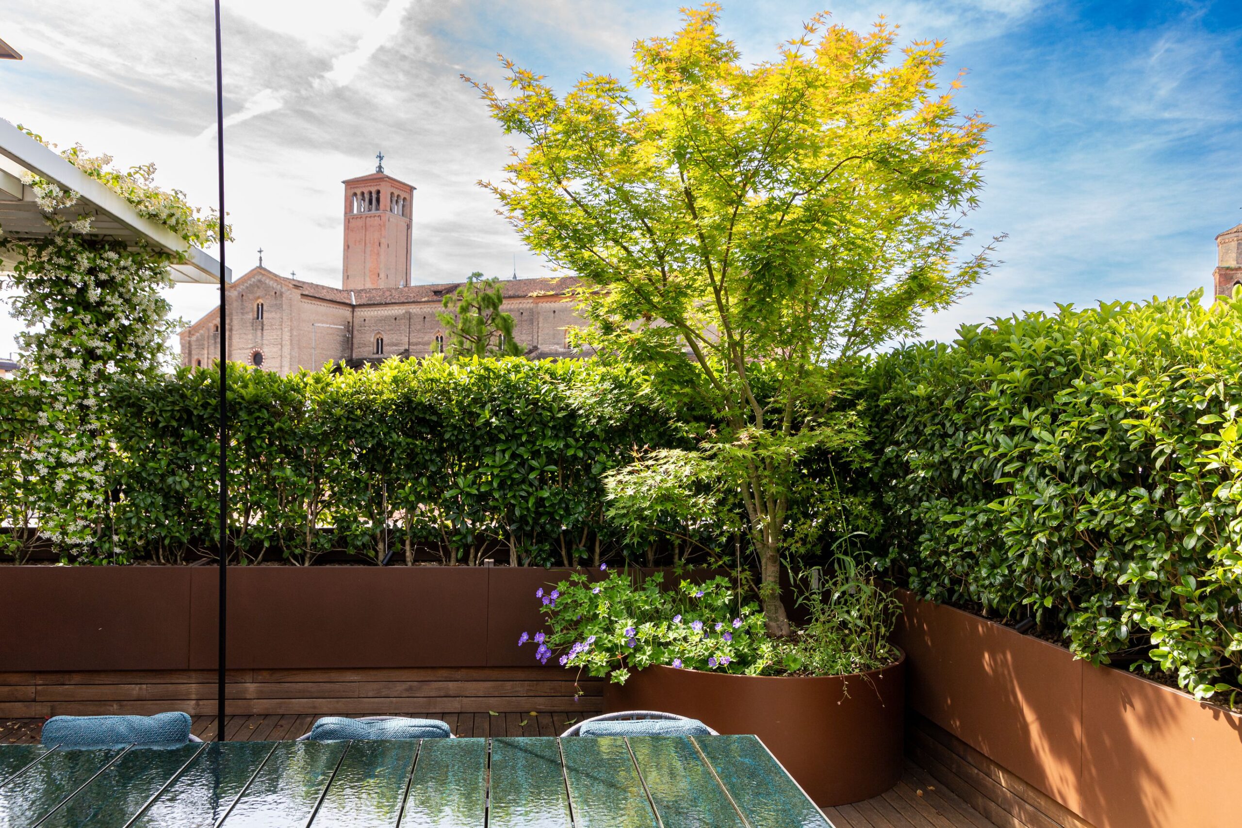 Terrazzo perimetrale di un attico localizzato all’ultimo piano di un edificio situato in centro storico.