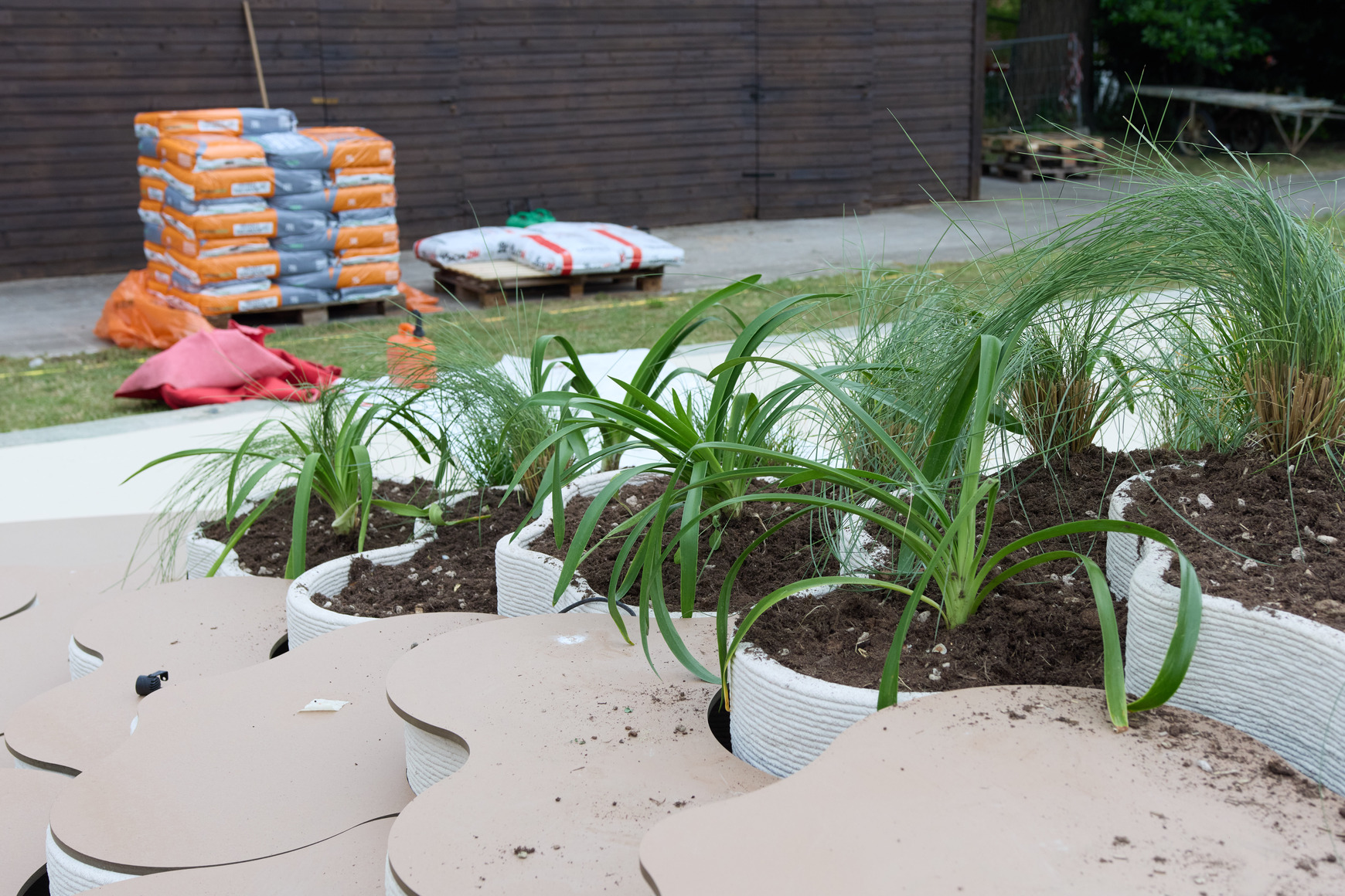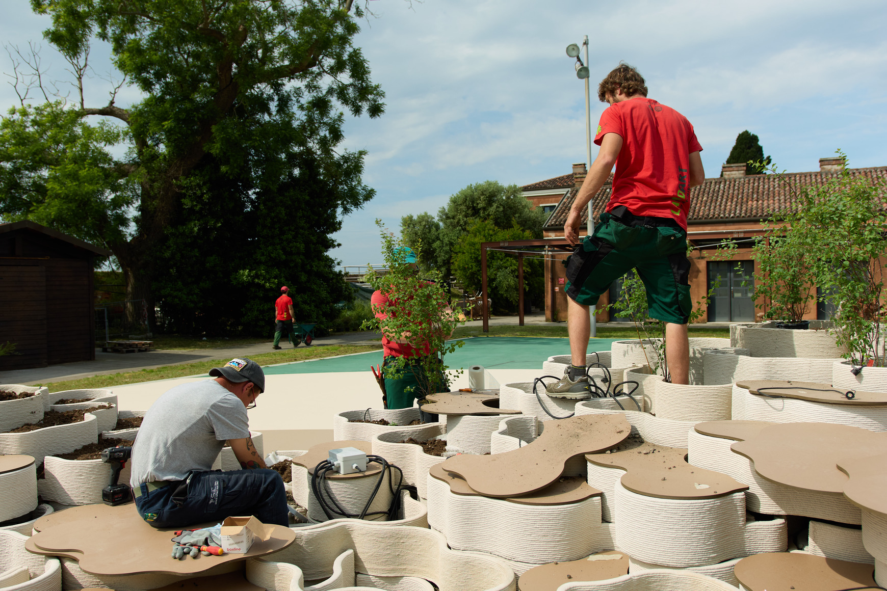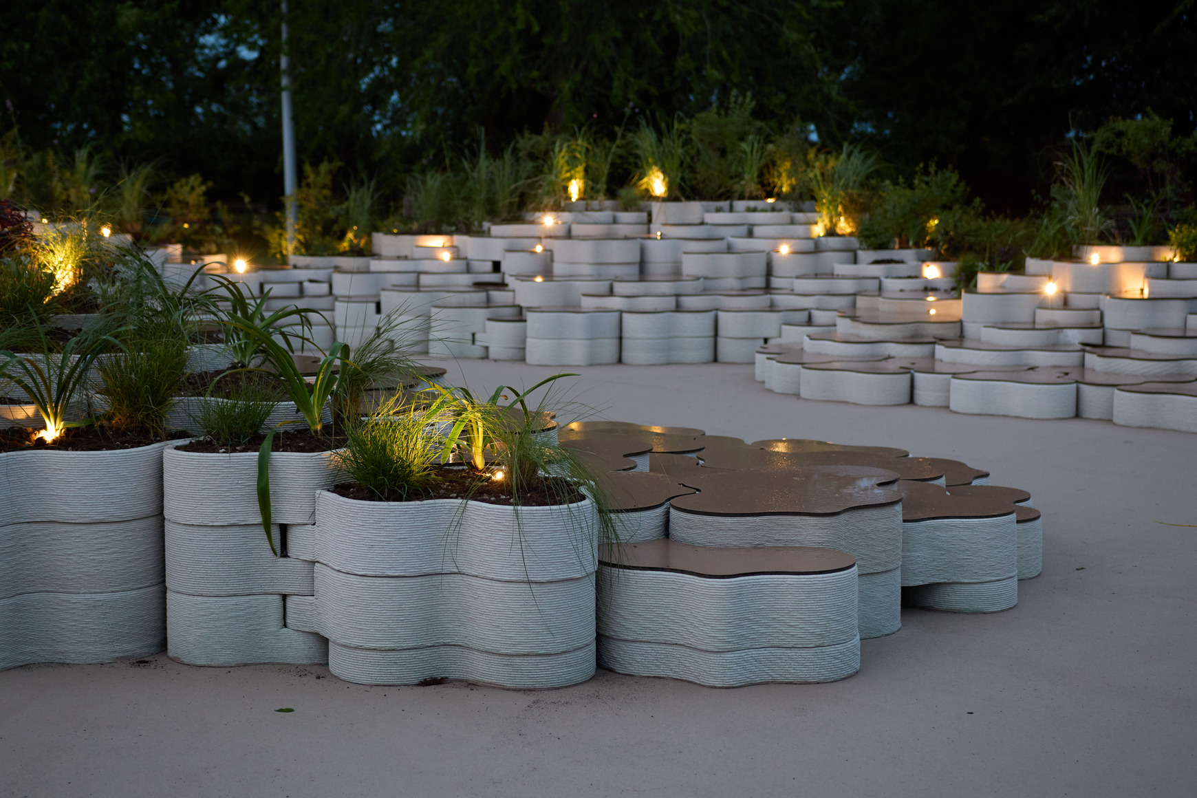 Grazie alla stampa 3D e all’uso di materiali sostenibili, la struttura si integra nel paesaggio con una forma organica che, come un fiore, nasce dal terreno.
